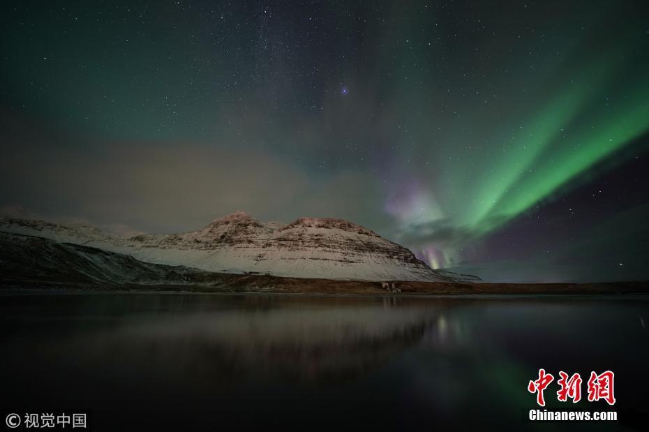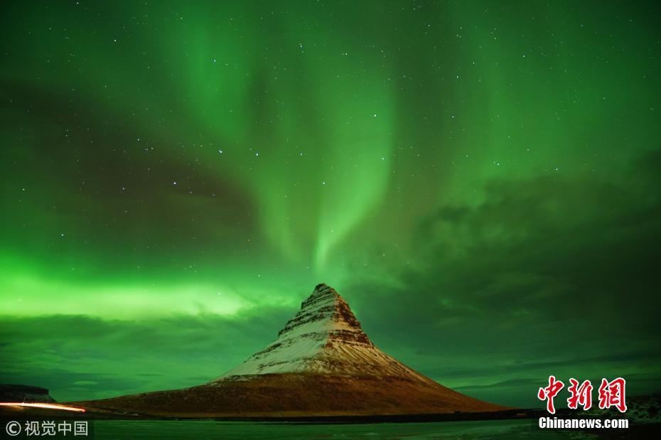 近日,冰岛西海岸高463米的Kirkjufell山上空出现极光,呈现出湖泊山峰极光交相辉的景观。图片来源:视觉中国