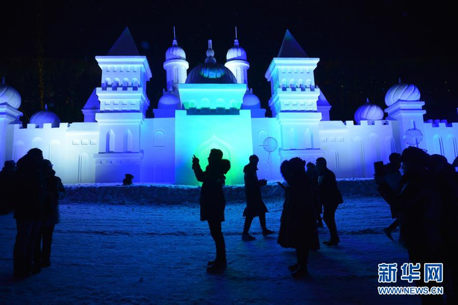 12月21日,游客在冰雪节开幕式上参观雪雕城堡。新华社记者邹予摄