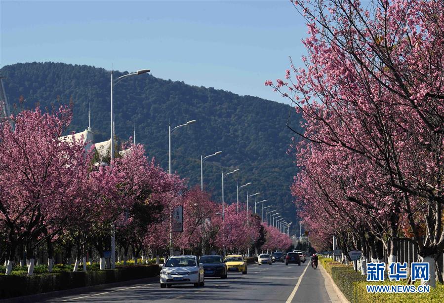 这是昆明市西山区红塔西路樱花大道(12月21日摄)。