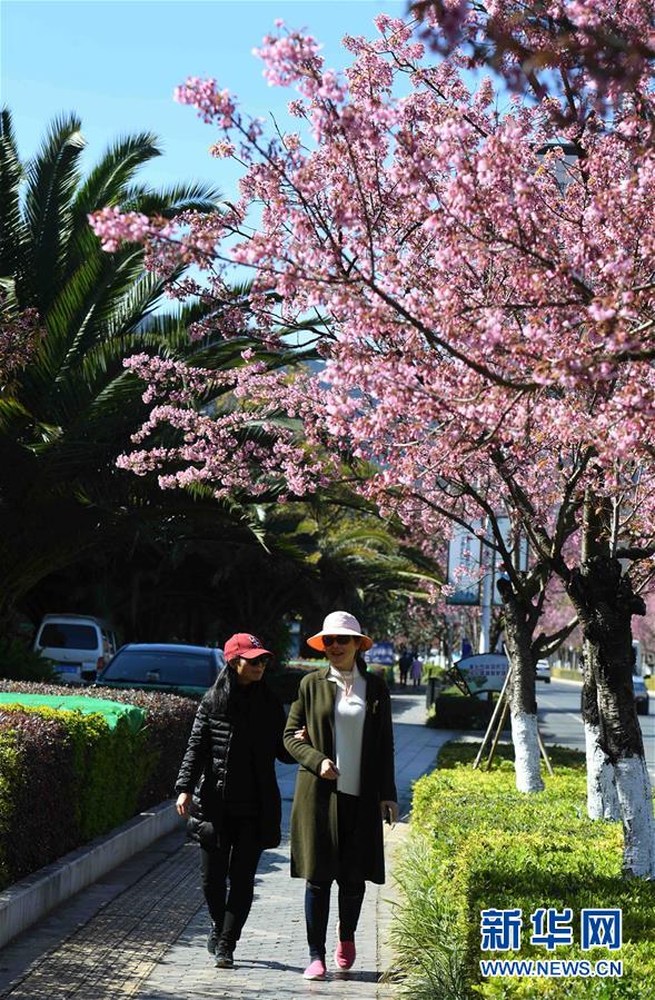 12月21日,游客行走在昆明市西山区樱花盛开的人行道上。新华社记者杨宗友摄