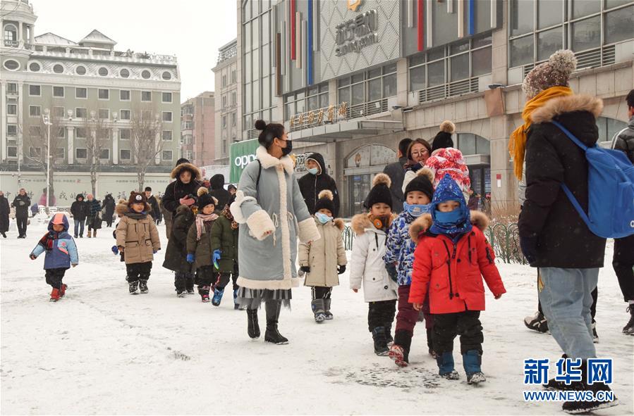 12月21日,游客在哈尔滨中央大街游览。当日,“冰城”哈尔滨迎来降雪天气,整个城市变得银装素裹。新华社记者韩宇摄