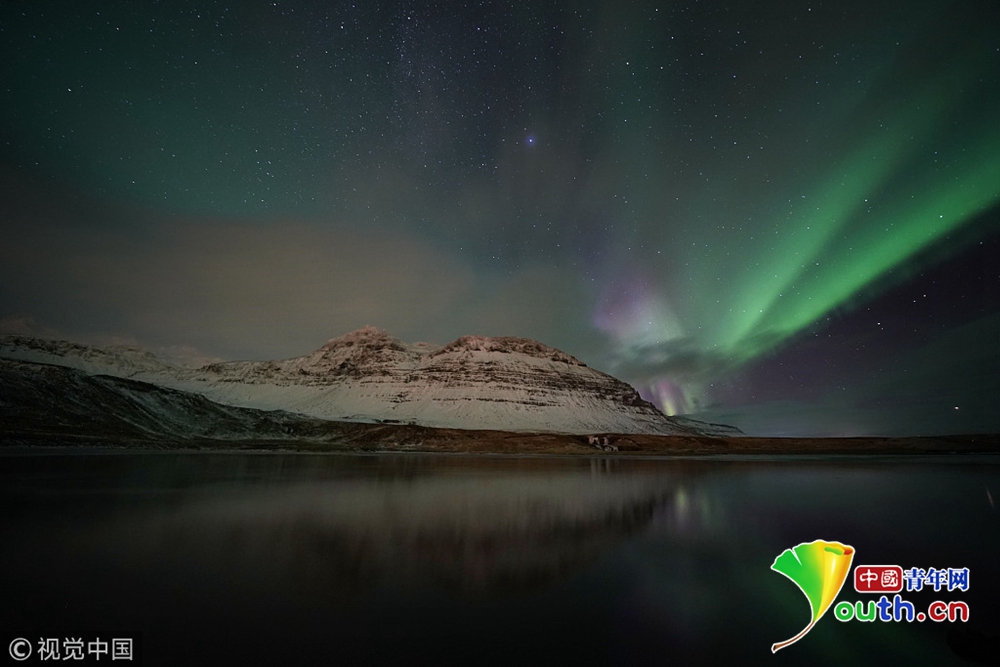 冰岛湖泊山峰极光交相辉映宛如梦境