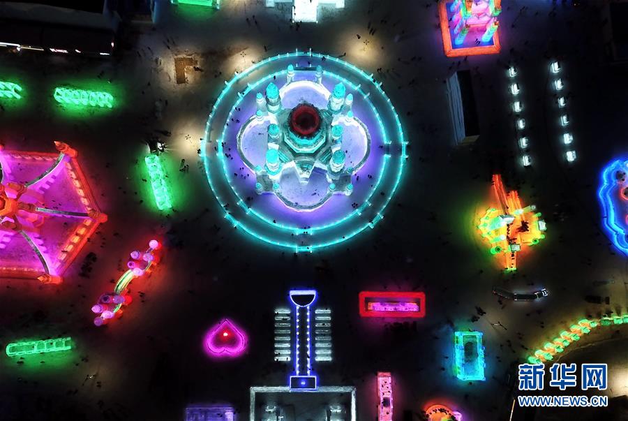 这是哈尔滨冰雪大世界园区内的一处景观(12月23日无人机拍摄)。