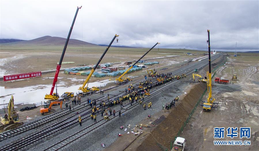 这是2017年7月26日无人机拍摄的青藏铁路格尔木至拉萨段扩能改造工程唐古拉车站拨接工作现场。 新华社记者 刘东君 摄