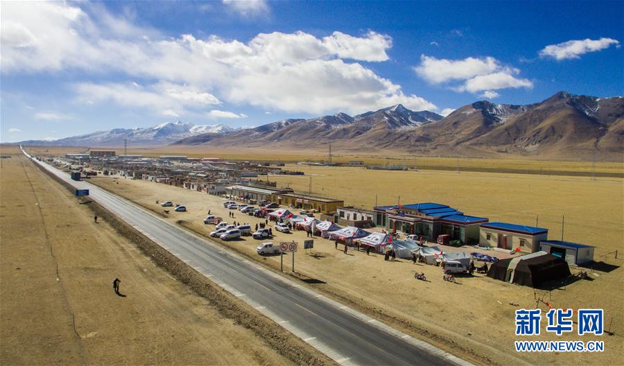 这是在青藏公路旁搭建的那曲县香茂乡畜产品展销会(2017年11月25日无人机拍摄)。 新华社记者 刘东君 摄