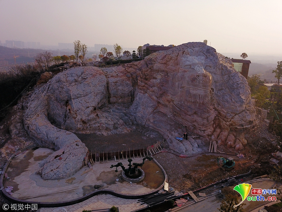 2018年12月23日,南京浦口区老山风景区三河采石场宕口,利用宕口废弃工地进行生态修复的蜂巢酒店主体完工。经过100名雕刻工人近半年的施工,酒店两侧被破坏的山体变成两只高30多米的巨型山体雕塑石狮,栩栩如生,场面极其震撼。