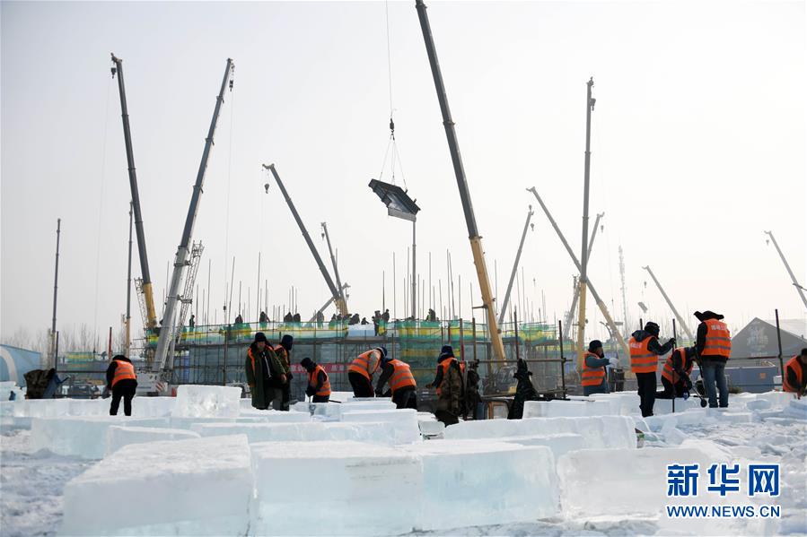 12月13日,工人在第二十届哈尔滨冰雪大世界园区施工。新华社记者 王建威 摄