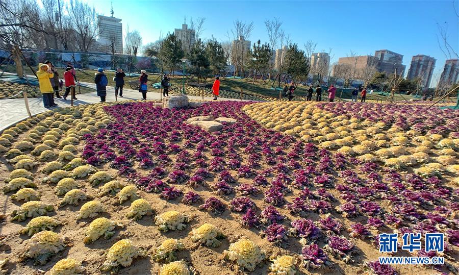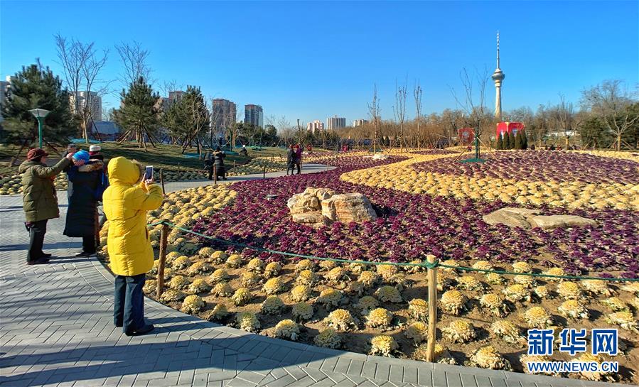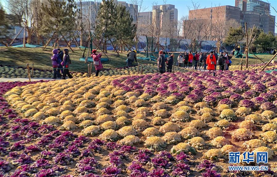 12月24日,游人在北京玉渊潭公园观赏甘蓝。 日前,北京市玉渊潭公园移栽的三万多棵紫色和黄色羽衣甘蓝盛开,为冬季公园增添了色彩。 新华社记者李欣摄