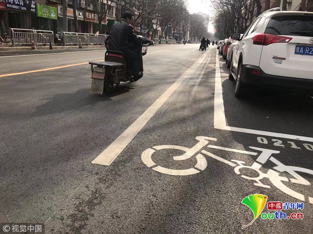 12月25日报道,12月24日,郑州市文化宫路有市民反映,新铺好的文化宫路非机动车道被刚划的“停车位”挤得只有0.8米宽。原本2米多宽的非机动车突然有汽车停放后,骑车经过的行人只得被逼进快车道通行,很不安全。