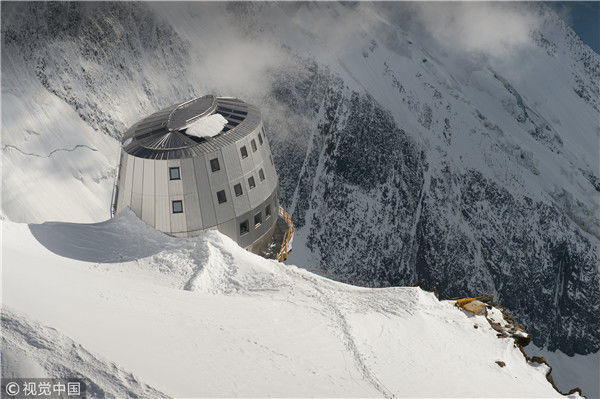 2012年8月6日消息(具体拍摄时间不详),法国圣热尔维,一座坐落在阿尔卑斯山脉上海拔3835米的旅馆近日落成,旅馆目前处于试运行状态直到8月底向公众开放。这座旅馆共有120个床位,达到了高环境质量标准。
