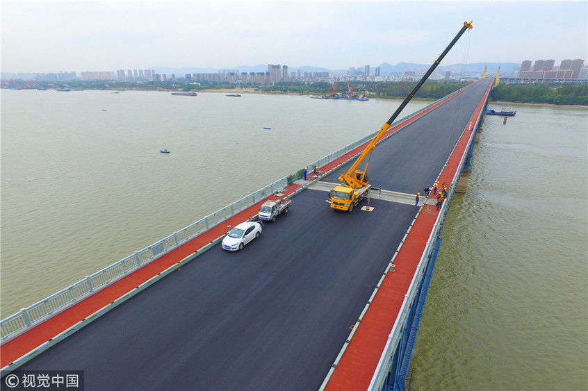 2018年10月19日,南京长江大桥主桥桥面铺上沥青,一辆吊车在南京长江大桥上作业。