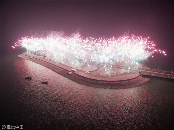2017年12月31日,港珠澳大桥全线亮灯,标志着全线供电照明系统施工圆满完成,意味着港珠澳大桥主体工程已经具备通车条件。亮灯仪式上,大桥东人工岛四周燃放起壮丽的烟花。
