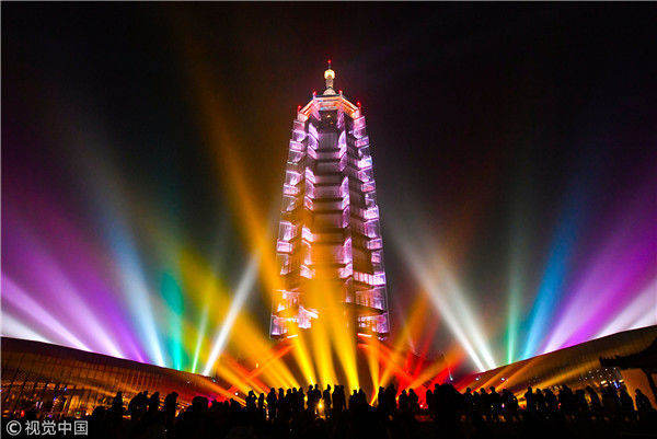 2017年12月31日跨年夜,南京,大报恩寺遗址公园内的大报恩塔塔身投影出“你好2018”的字样,众多市民前来撞钟,为家人和朋友祈福,迎接新年。