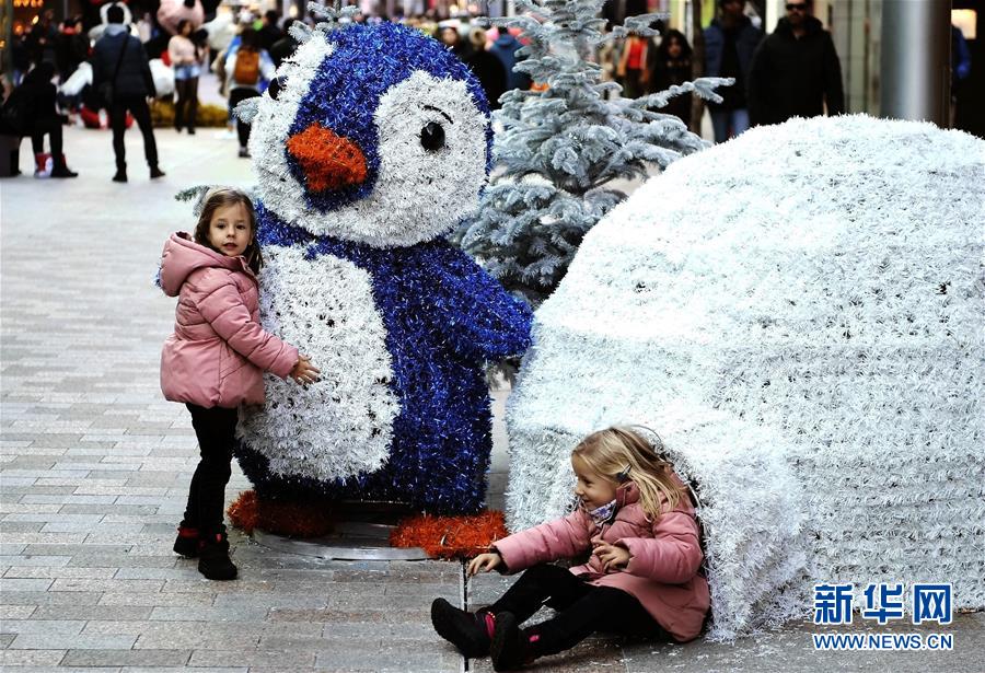 12月23日,在安道尔首都安道尔城,两名女孩与装饰物合影。新华社记者郭求达摄