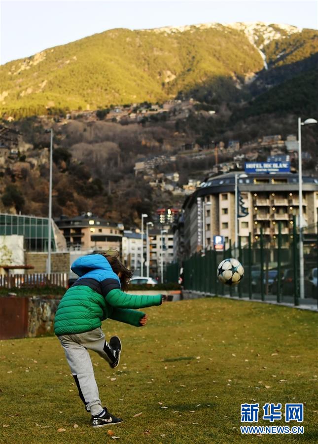 12月23日,在安道尔首都安道尔城,一个男孩在一处绿地上踢球。新华社记者郭求达摄