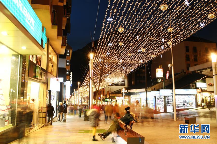 12月23日,在安道尔首都安道尔城,商业街被彩灯装点。新华社记者郭求达摄
