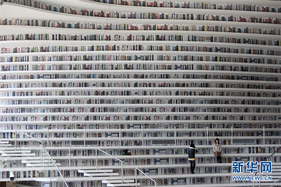 12月27日,读者在天津滨海新区图书馆中庭的“书山”上拍照。 滨海新区图书馆位于天津滨海文化中心,2017年10月1日正式开馆,设计立意为“滨海之眼”和“书山有路勤为径”。图书馆现有藏书60多万册,一年多来接待读者约280万人次,已成为滨海新区的文化“新地标”。 新华社记者伍婧丹摄