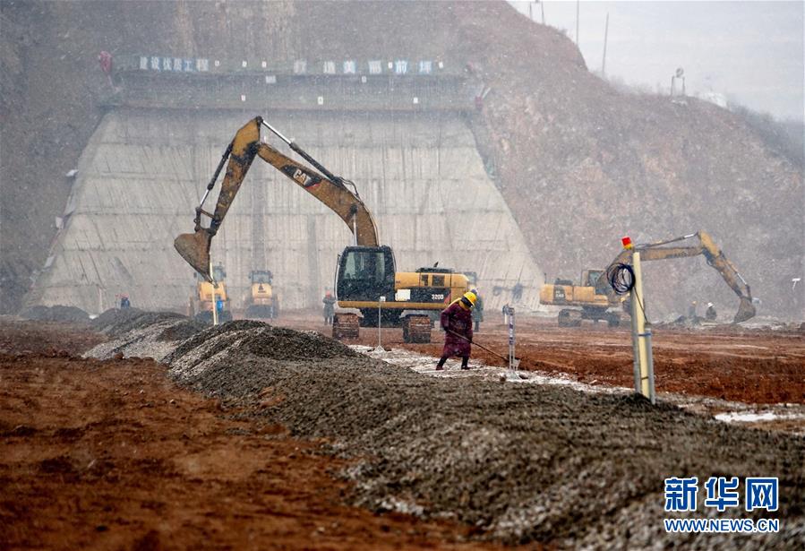 12月27日,工作人员和大型机械在前坪水库大坝上施工。目前,被国务院列为172项节水供水重大水利工程之一的前坪水库主体工程建设进度已超八成。该水库位于河南省汝阳县前坪村,是一座以防洪为主,兼具供水、灌溉、发电功能的大型水利枢纽工程。新华社记者 李安 摄