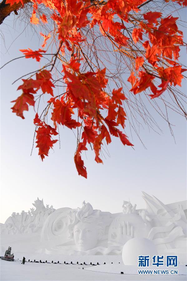 12月28日,工作人员在雪塑《星河之旅》前作业。