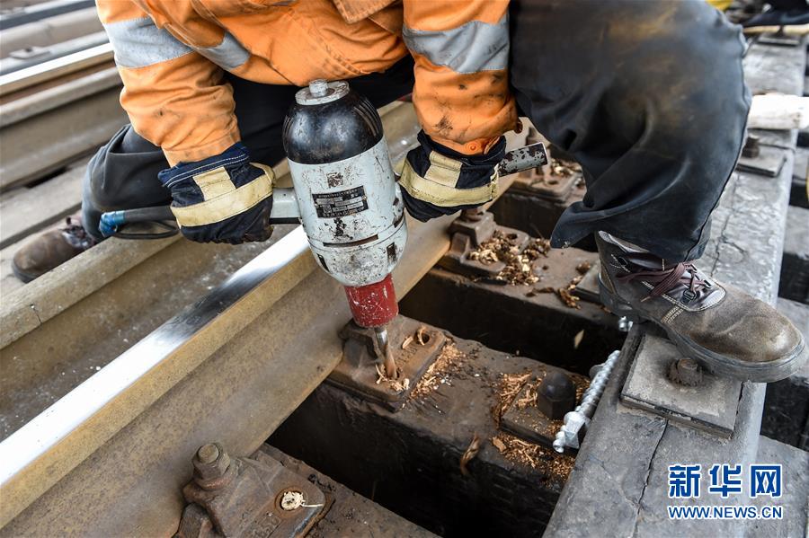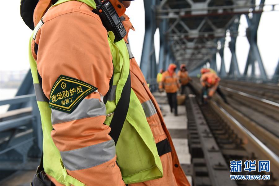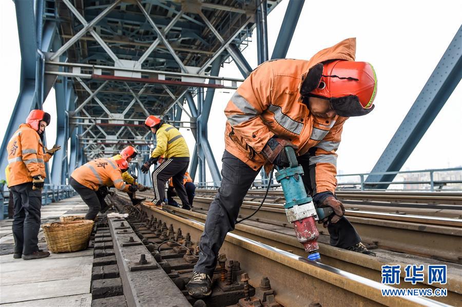 线路工们在南京长江大桥铁路桥进行木枕改道作业(12月27日摄)。