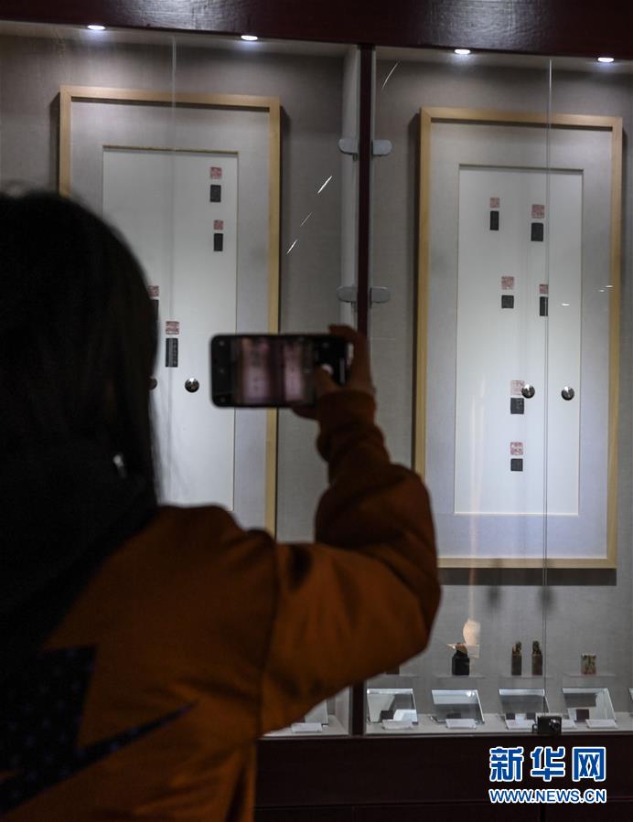 12月29日,观众用手机拍摄展出的金石篆刻印章。 当日,“中国竹扇之乡”——浙江省安吉县鄣吴镇举办传统文化迎新年活动。举办包括扇文化博览会、扇面艺术展、制扇工艺展示及金石、拓印文化展示等活动,弘扬中华优秀传统文化。 自上世纪七十年代以来,鄣吴镇开始发展制扇产业,现在该镇有各类制扇企业80余家,制扇行业从业人员2000多人,年产值达2亿多元。 新华社记者 徐昱摄