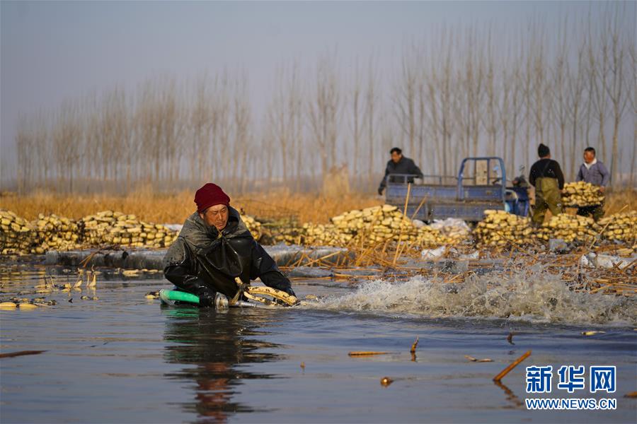 1月31日,在雄安新区安新县东向阳村的一处藕塘,挖藕工将挖出来的藕洗干净后装车运走。新华社记者沈伯韩摄