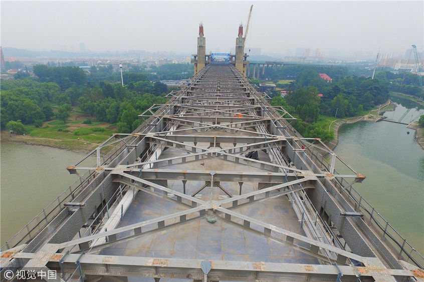 2017年9月19日,南京长江大桥正桥的混凝土面板已经全部拆除,仅剩交错纵横的钢桁架横跨在长江之上,从高空俯瞰犹如一条“钢铁巨龙”。