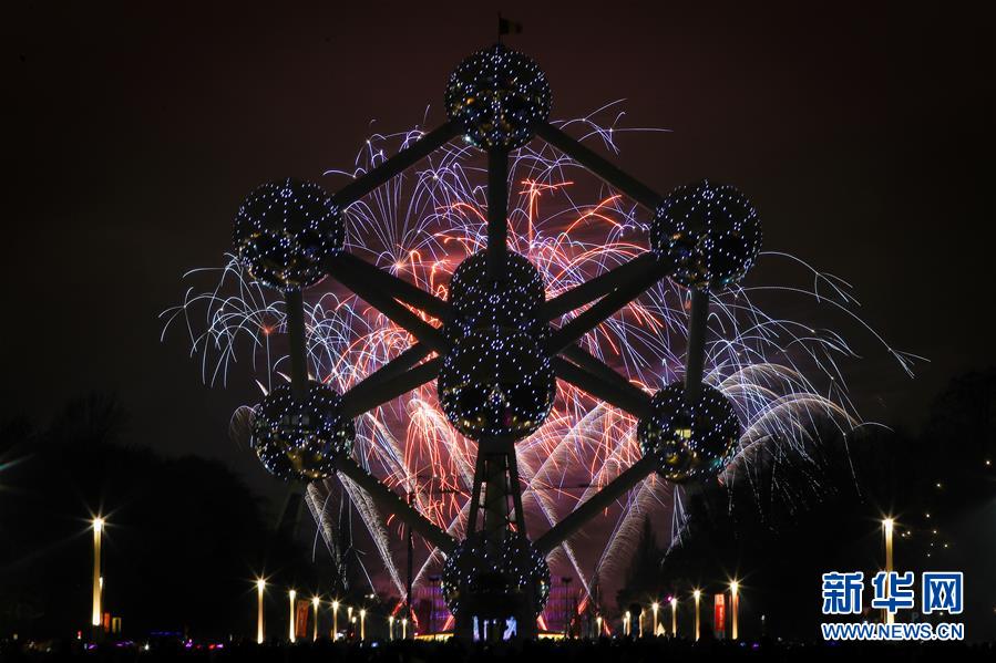 1月1日,比利时首都布鲁塞尔的地标性建筑——原子球塔附近烟花绽放。 新华社记者郑焕松摄