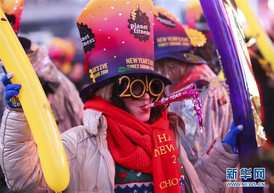 1月1日,在美国纽约时报广场,一名女子参加跨年活动。 新华社记者王迎摄