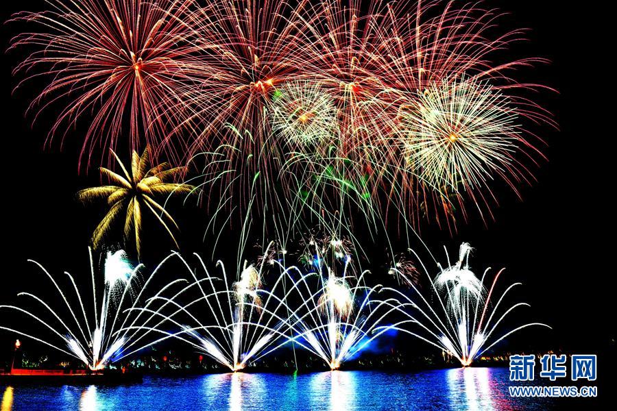 这是1月1日在葡萄牙首都里斯本的特茹河上拍摄的烟火表演。 新华社记者张立云摄