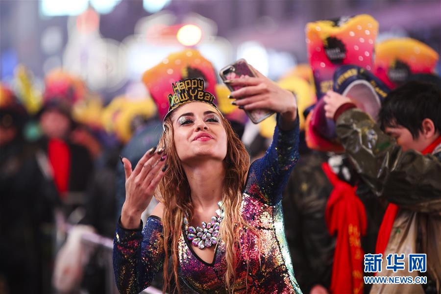 1月1日,在美国纽约时报广场,一名女子在新年钟声敲响后自拍。 新华社记者王迎摄