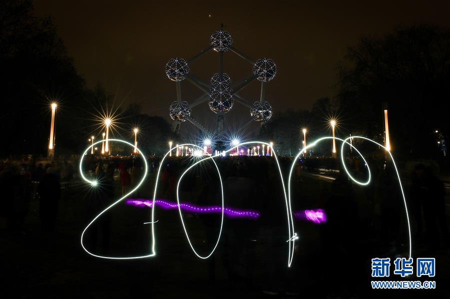 2018年12月31日,游客在比利时首都布鲁塞尔的地标性建筑——原子球塔前用光绘出2019的字样,迎接即将到来的2019年。 新华社记者郑焕松摄