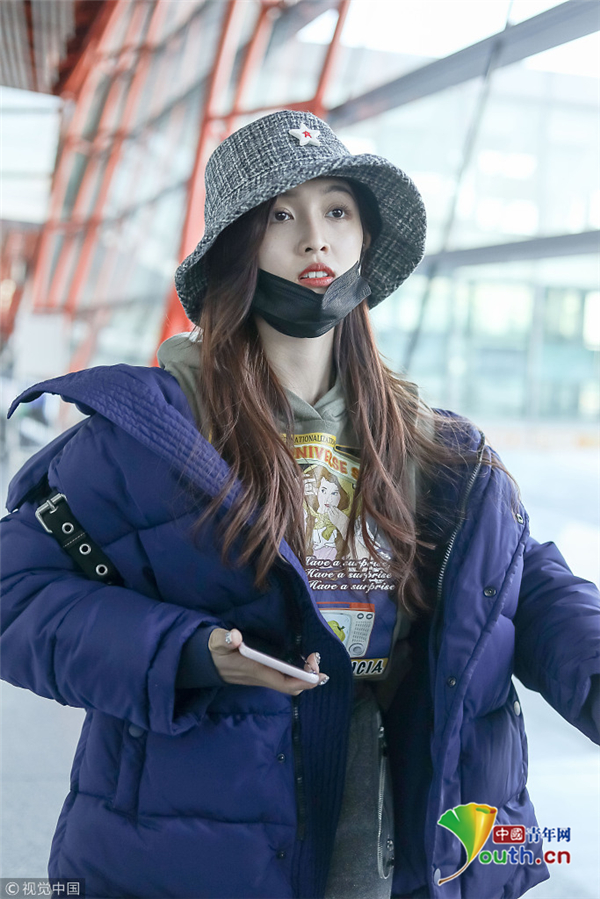 吴宣仪穿厚重羽绒服超保暖 歪戴渔夫帽显俏皮可爱