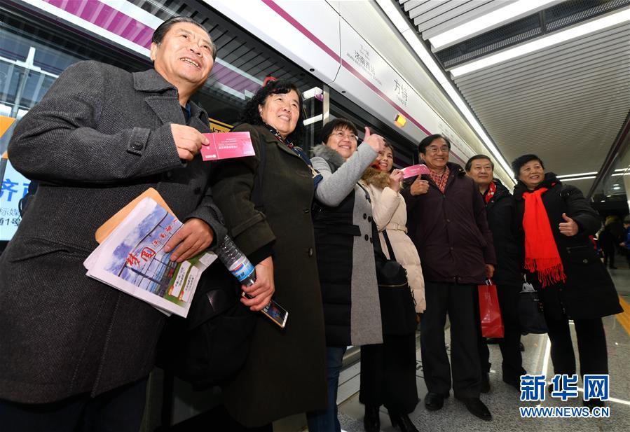 2019年1月1日,乘坐首发车的乘客在地铁站内拍照留念。 新华社记者朱峥摄
