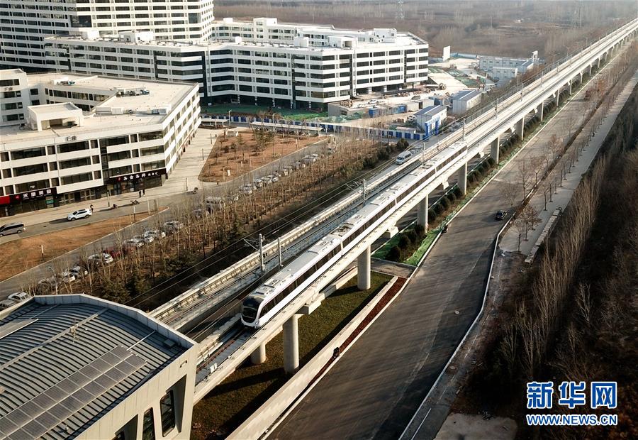 这是2018年12月29日无人机拍摄的车辆通过济南轨道交通1号线创新谷站。新华社记者朱峥摄