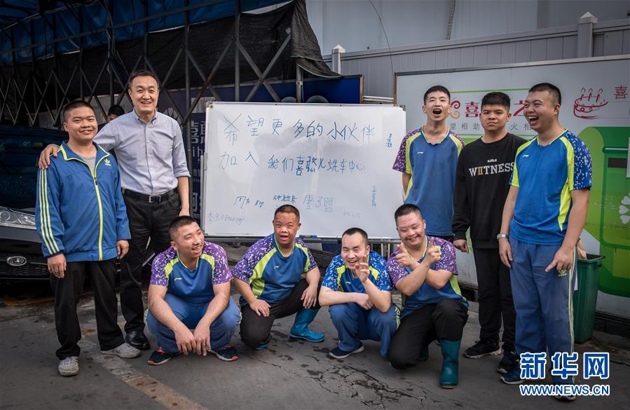 深圳喜憨儿洗车中心的创始人曹军(左二)和员工唐一盟、李嘉师、刘威、周灰、李纪政、种新来、陈星佑和黄熠(左至右)在位于深圳市福田区梅林凯丰路的喜憨儿洗车中心留影(2018年12月26日摄)。这个洗车中心是由心智障碍孩子的家长联合成立,喜憨儿在这里接受训练后组成特殊的洗车团队,自力更生的同时接触社会。新的一年,曹军和喜憨儿的希望是让更多的心智障碍者加入到洗车中心,实现自身的价值。 新时代是奋斗者的时代,是追梦人的舞台。2019年,万千追梦人朝着新的目标迈进,为实现心中的理想而奋斗。 新华社记者毛思倩摄