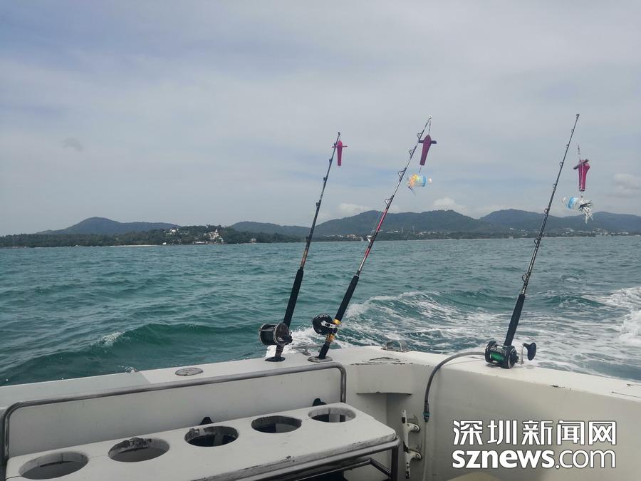 普吉岛码头上,船还没起航,三个海钓鱼竿早已准备就位了