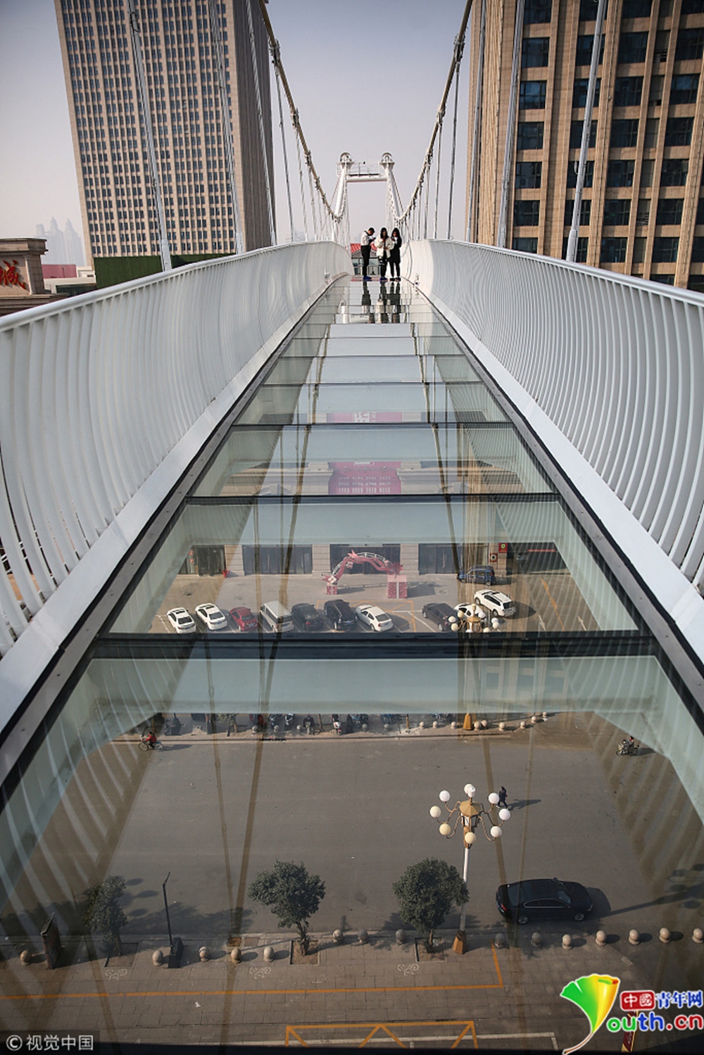 玻璃吊桥被三座高层写字楼所环绕,紧邻石家庄火车站和南二环高架桥,车流、人流密集。