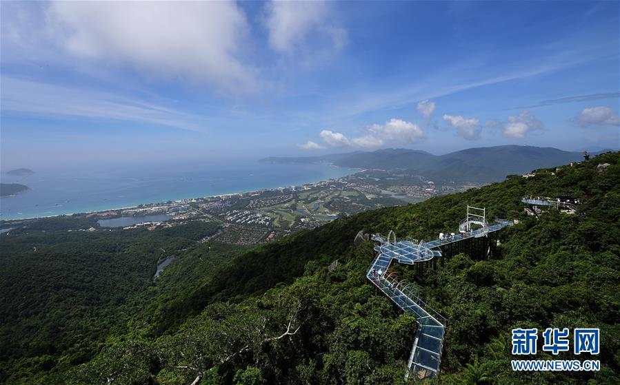 8月31日,游客在玻璃栈道上参观游览。近日,位于海南省三亚市亚龙湾热带天堂森林公园的大佛石全海景玻璃栈道开始正式营业。凌空而建的玻璃栈道全长400米,游客可将亚龙湾的美景尽收眼底。新华社记者郭程摄