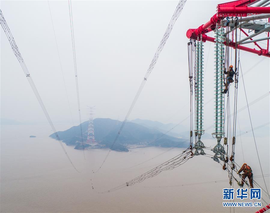 1月3日,施工人员在高塔上进行验收和消缺作业(无人机拍摄)。新华社记者 徐昱 摄