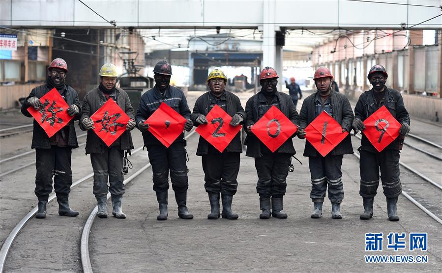 在山西焦煤西山煤电官地矿,刚刚升井的掘进一队工人康迎明、李小明、郭永军、牛晓军、蒋晓兵、李军泉、蒋文兵(从左至右)拿着工人们自己写的“你好,2019”在井口前合影(2018年12月26日摄)。聊起2019年的规划和心愿,掘进一队的工人们说,希望大家都健健康康、平平安安,工资能再上一个新台阶,也希望大家都刻苦钻研技术,每个人都能成为技术能手。 新华社记者詹彦摄