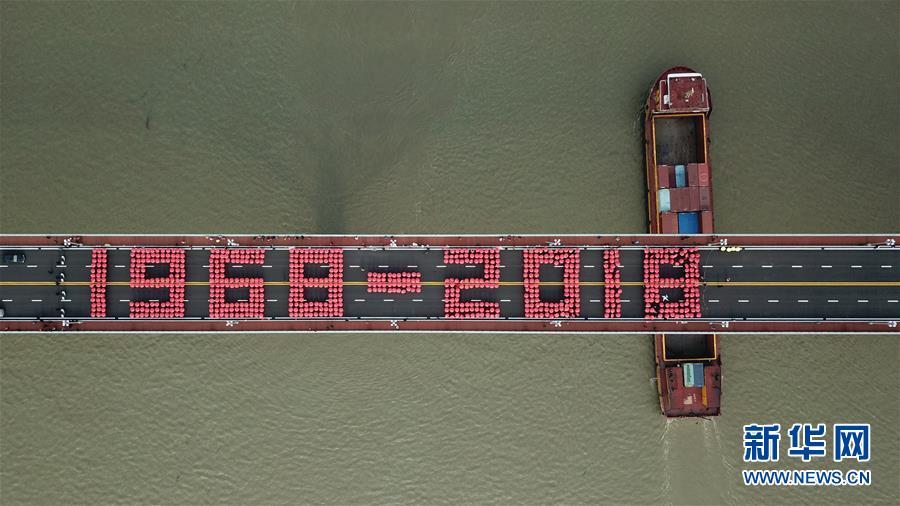 2018年12月24日,江苏省南京市民代表在修葺一新的南京长江大桥公路桥桥面拼出了“1968-2018”的字样,迎接即将恢复通车的南京长江大桥。 新华社记者 李博摄