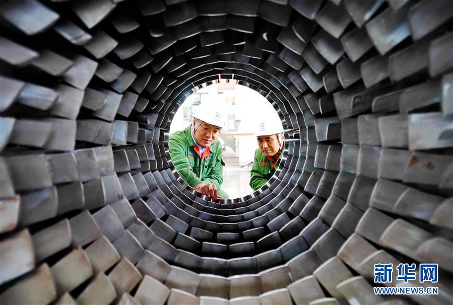 2018年12月23日,韩宏升(左)与公司技术员察看待修复蒸汽轮机叶片的损坏程度。