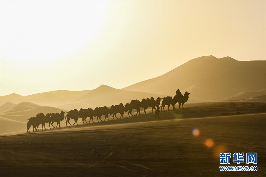 近日,内蒙古自治区第二届骆驼那达慕在阿拉善盟阿拉善左旗举行。这是2018年12月26日,牧民带领骆驼行走在腾格里沙漠中。 新华社记者 刘磊 摄