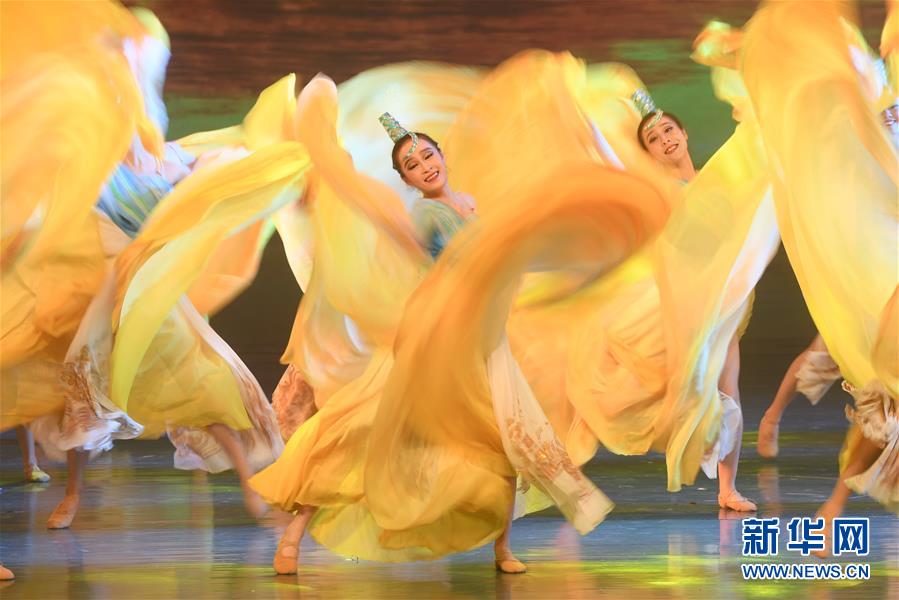 2018年12月25日晚,福建优秀舞蹈作品展演活动在福州举行,集中展示福建省近年来舞蹈创作的丰硕成果和舞蹈表演水平,来自全省9个单位的13个作品参加展演。这是当日在福州大戏院,演员在表演群舞《金色的海》。 新华社记者 宋为伟 摄
