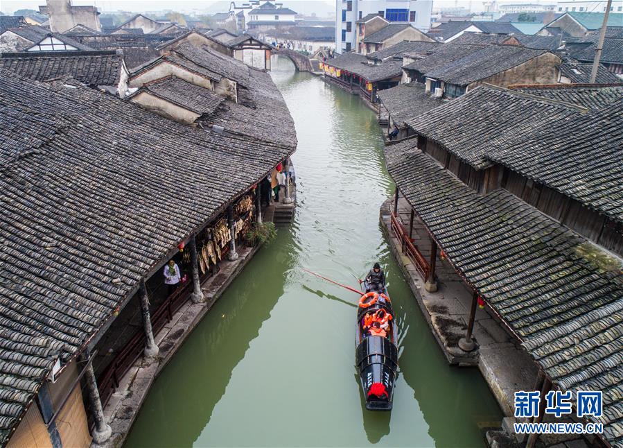 1月6日,游客乘坐传统乌篷船游览安昌古镇(无人机拍摄)。 新华社记者 徐昱 摄