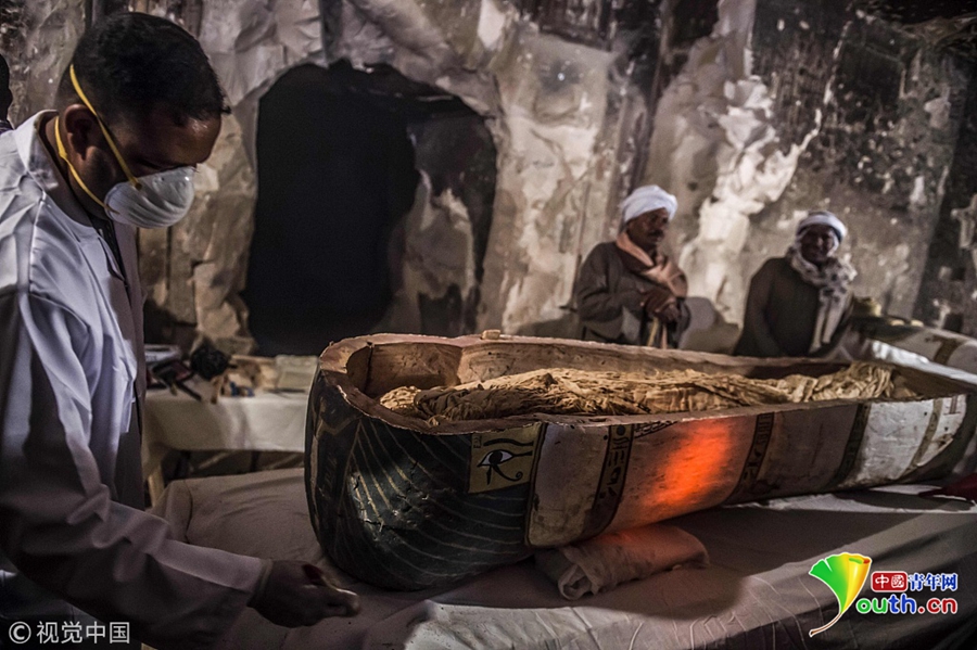 当地时间2018年11月24日,埃及卢克索,考古学家在当地发掘出一处墓穴,在其中发现石棺、木乃伊等文物,时间可追溯至公元前4-7世纪。