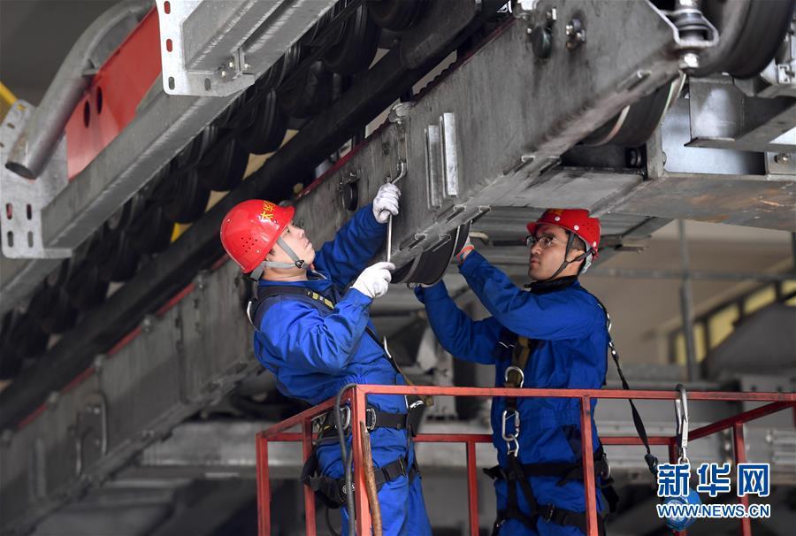 张新建(左)和梁斌在更换华山太华索道驱动站取力轮(2018年12月3日摄)。新华社记者 刘潇 摄