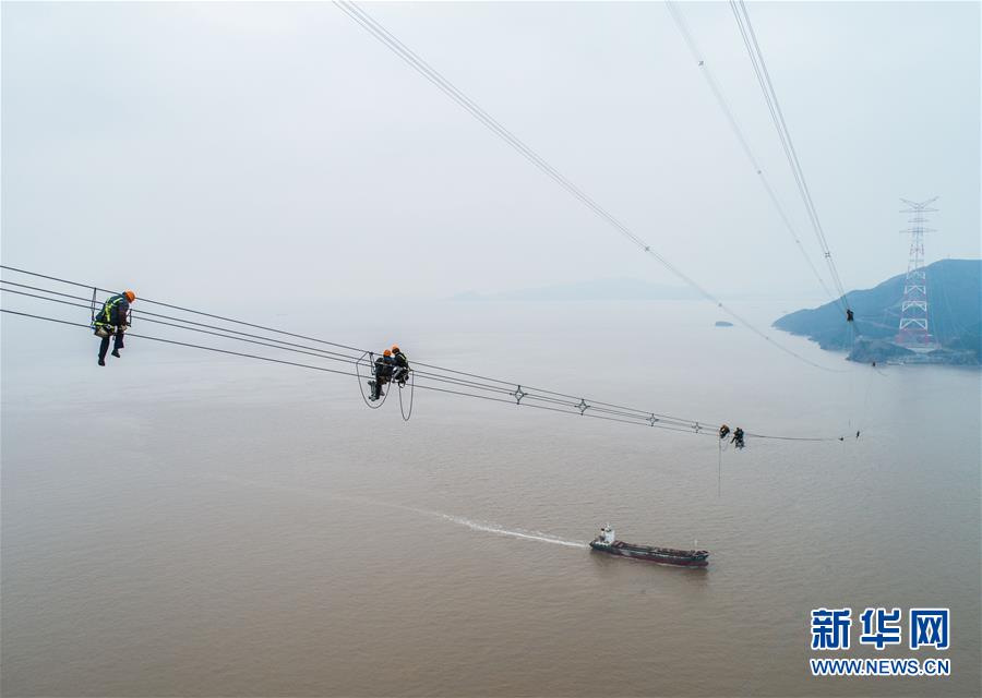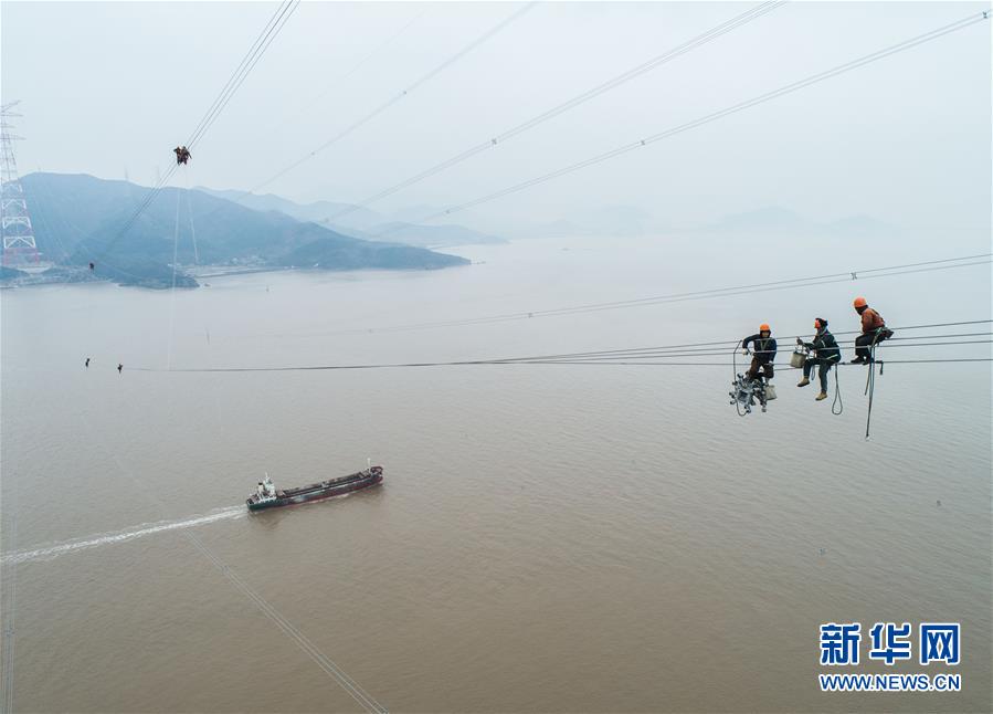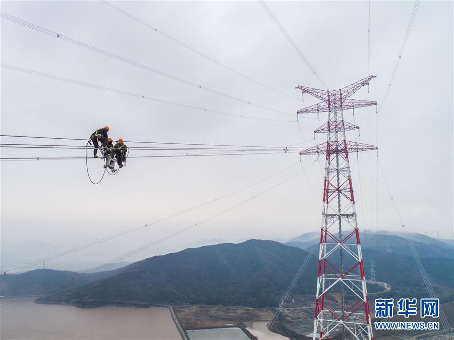 1月3日,施工人员沿着直径2.5厘米的导线进行高空行走,逐段排查导线隐患,确保投运后工程安全稳定运行。新华社记者 徐昱 摄
