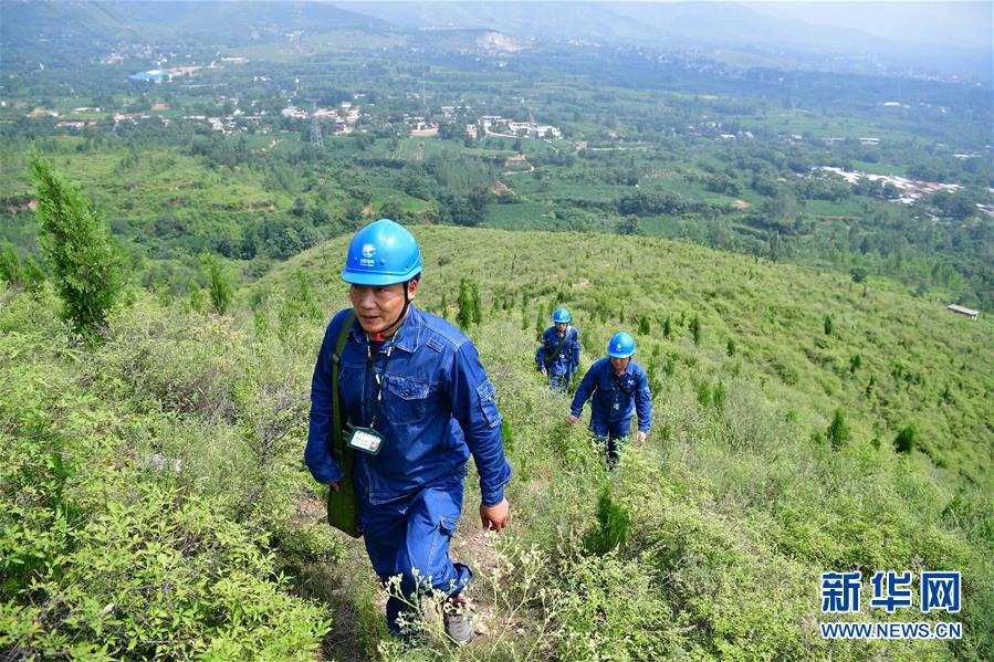 7月24日,在河南省新密市牛店镇花家店村,张长栓(前)走在巡线路上。 盛夏时节,用电负荷攀升,各地巡线工人坚守在工作一线,保障用电安全。 “90后”吴俊鹏是国家电网郑州供电公司输电运检室一名普通巡线工,他和师傅——有着33年工作经验的老“蜘蛛侠”张长栓一起,每日冒着酷暑攀爬高压输电铁塔巡视检查。吴俊鹏说:“虽然辛苦,但通过努力保障社会正常用电,我感觉特别值得。” 新华社记者 冯大鹏 摄